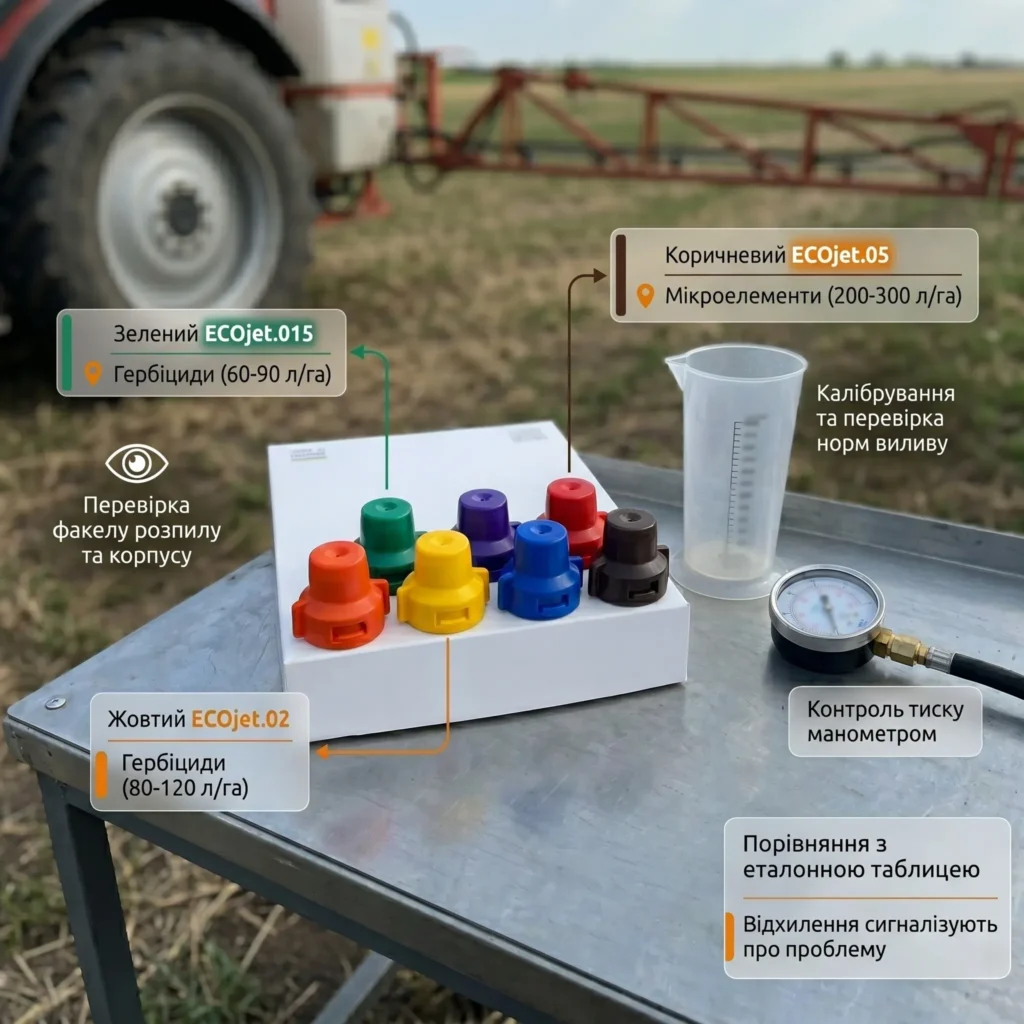 Калібрування та перевірка робочих параметрів є основою ефективності. Розпилювачі ECOjet розрізняються за кольором, кожен з яких відповідає певній нормі виливу: