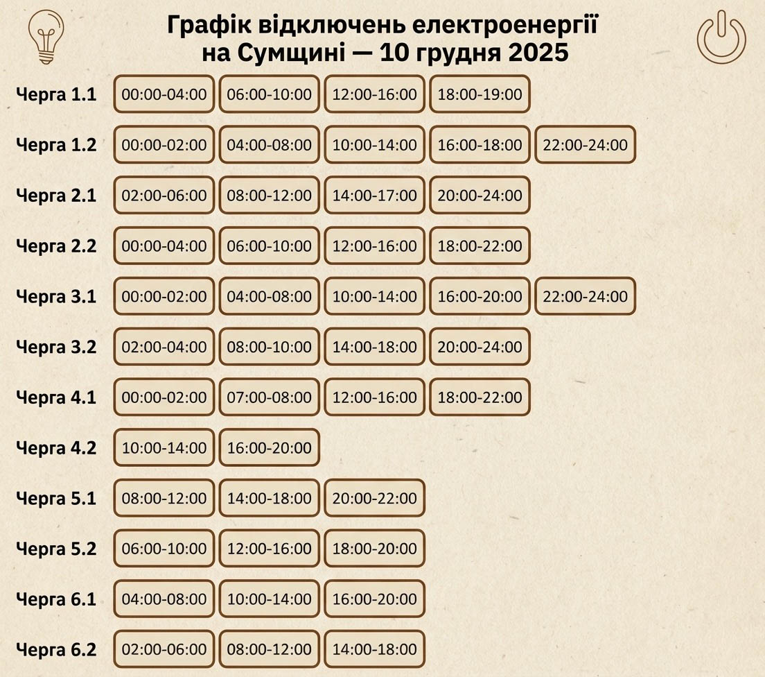 У середу, 10 грудня, на Сумщині діятимуть графіки погодинних відключень електроенергії .