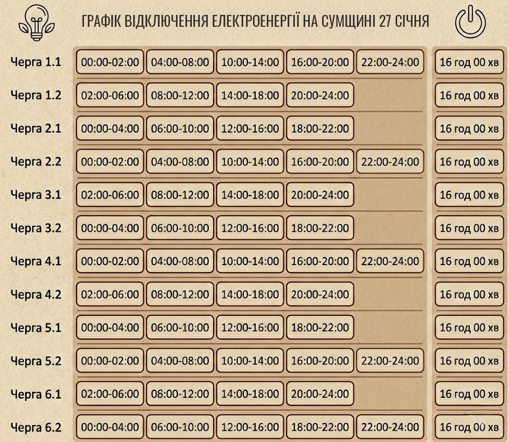 У вівторок, 27 січня, на Сумщині діятимуть графіки погодинних відключень електроенергії.