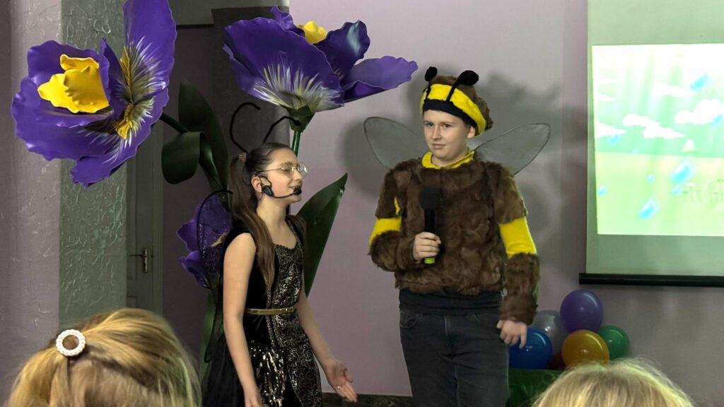 Під керівництвом керівника гуртка Катерини Волкової, юні актори перетворили сцену на справжнє казкове королівство природи. Глядачі побачили яскраві образи: працьовитого джмеля, непосидючої мухи, чарівного метелика, сонечка та веселку. Дійство доповнювали декорації — велетенські жовті тюльпани та тематичний відеосупровід, що створювали атмосферу затишку й тепла, незважаючи на осінню погоду за вікном.