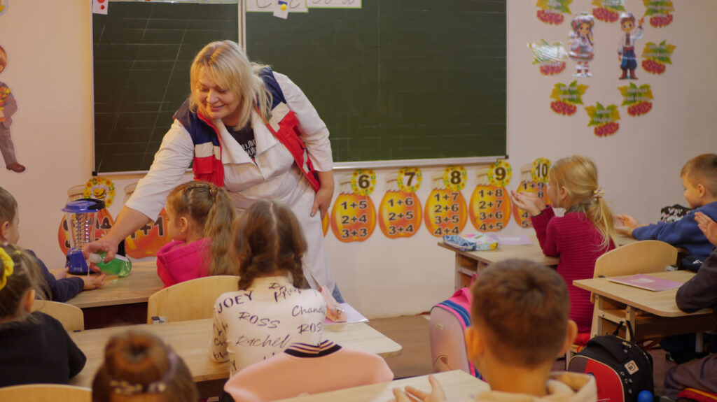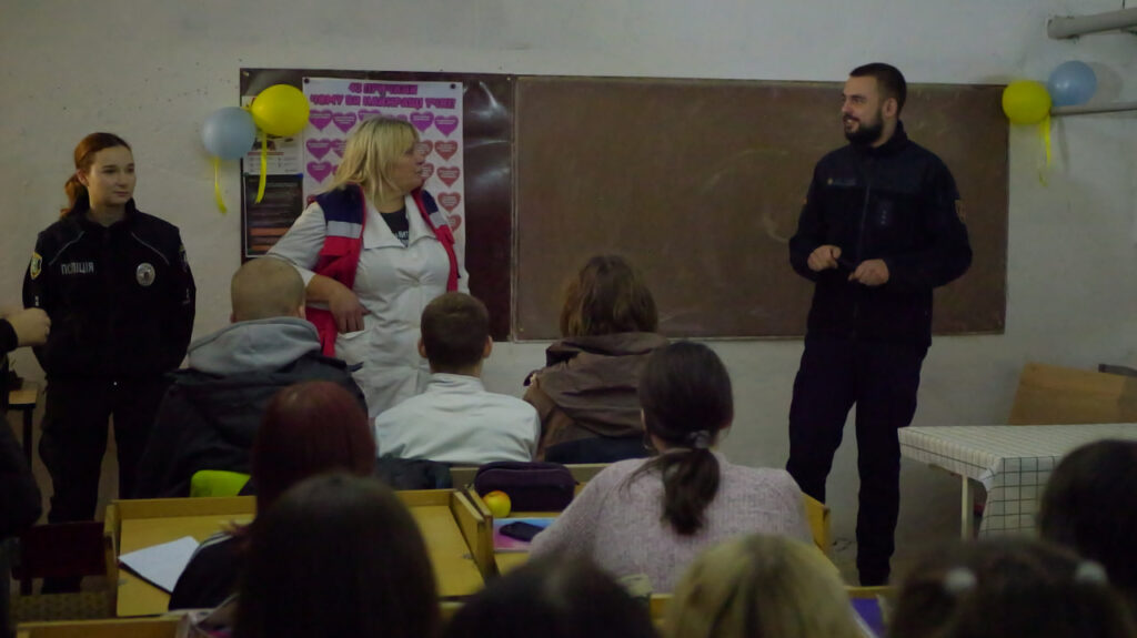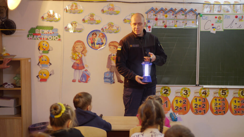 Для молодших школярів заняття пройшло у доступнішій формі. Дітям пояснили алгоритм дій, якщо світло раптово зникне, коли вони вдома чи у школі. Крім того, рятувальники та поліцейські вкотре наголосили на життєвій важливості носіння світловідбивних елементів на одязі чи рюкзаках у темну пору доби.